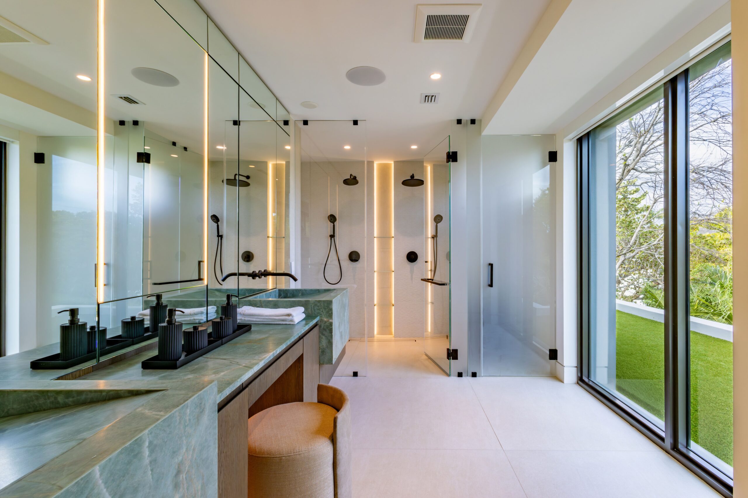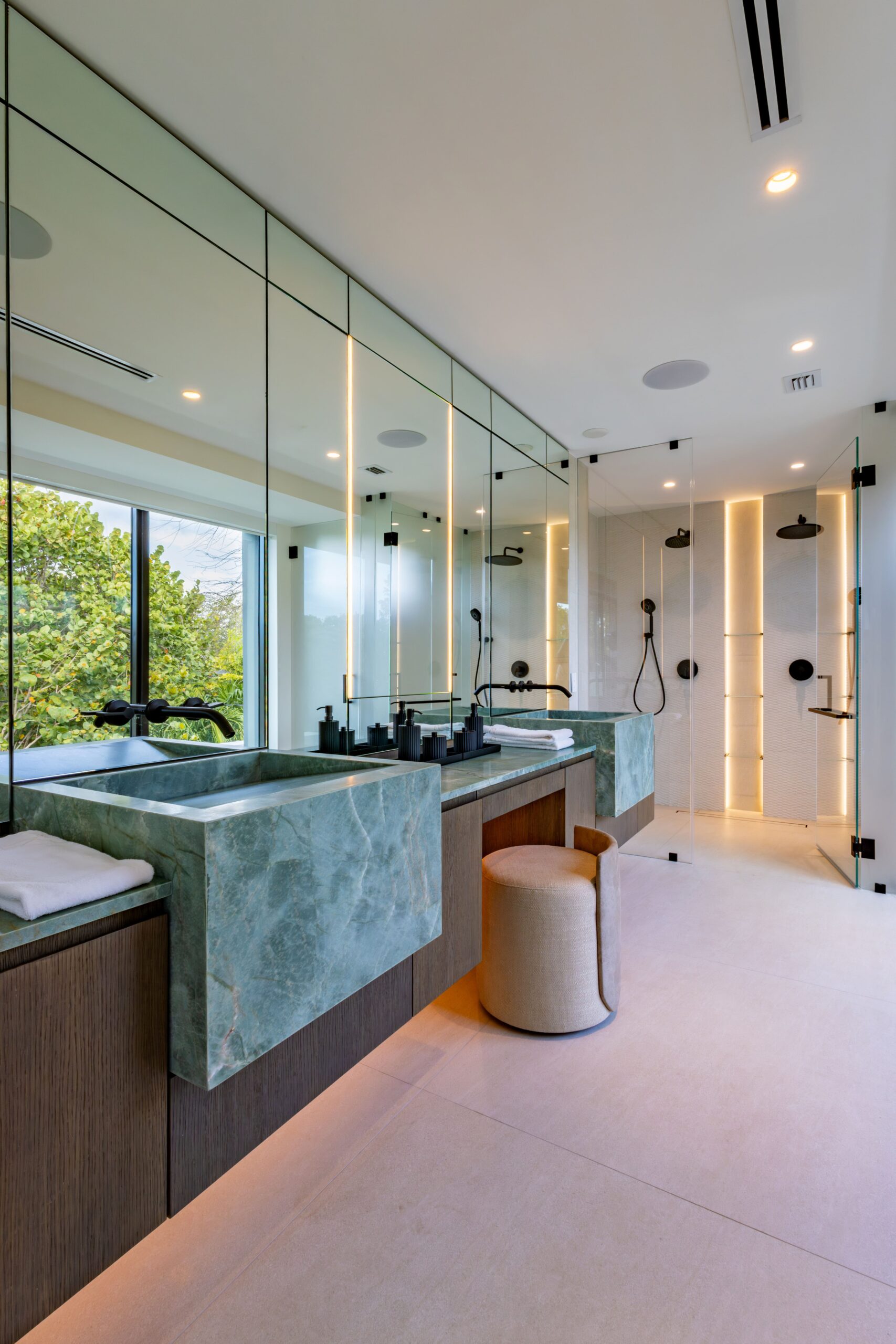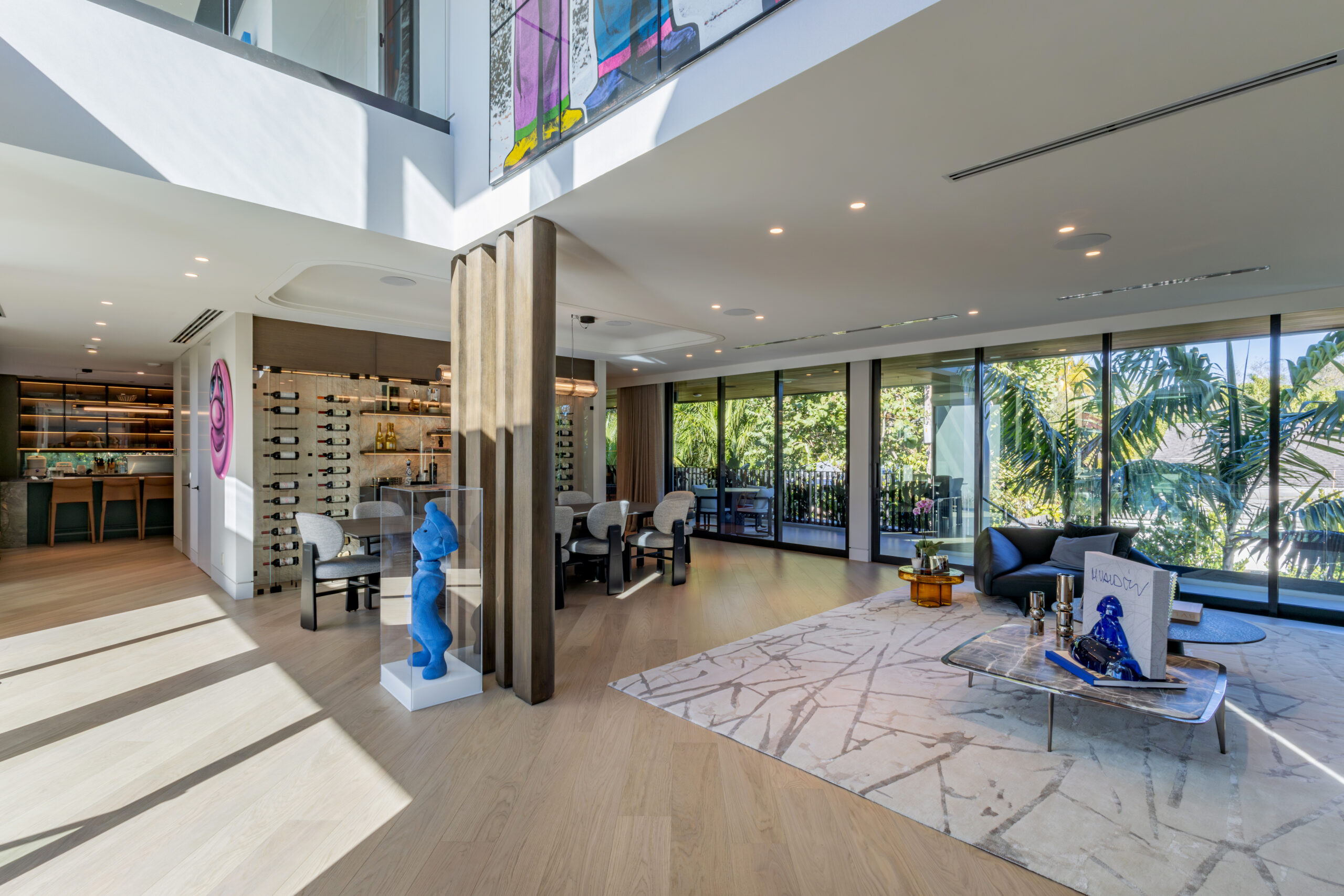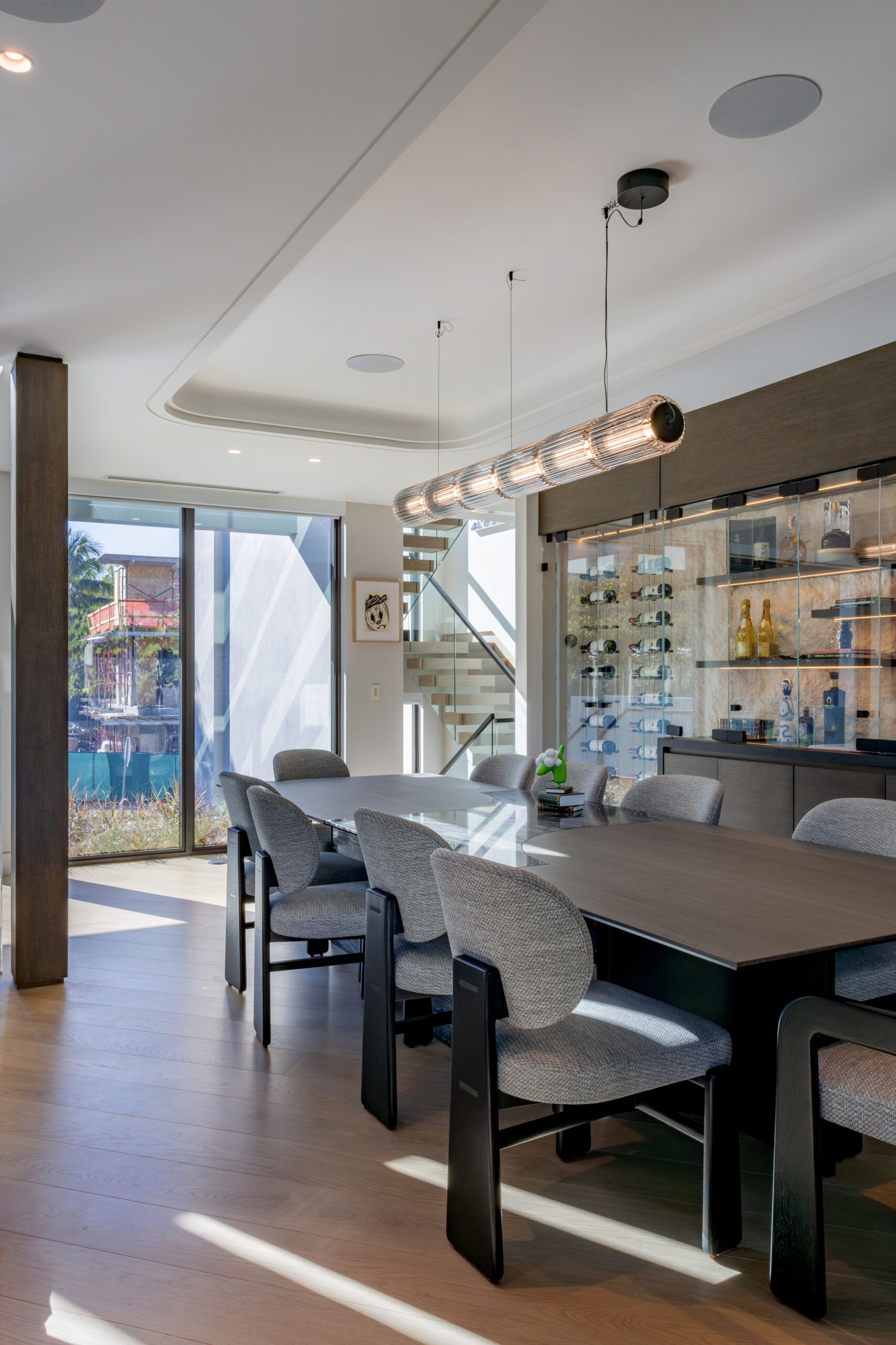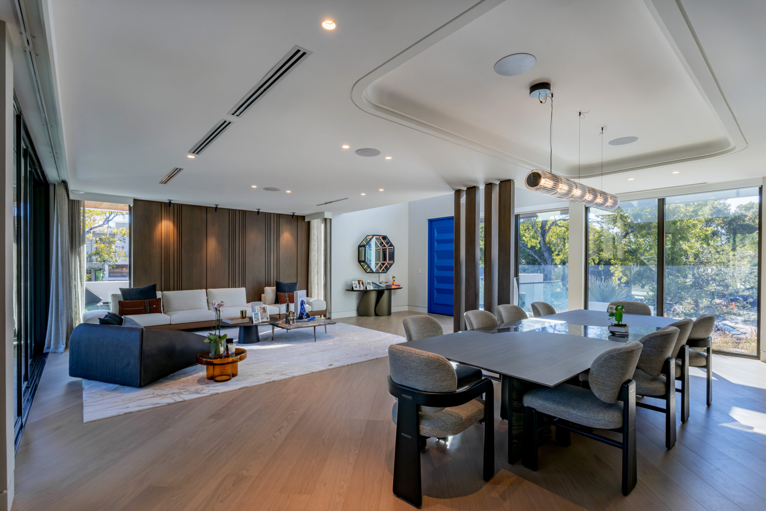 This ultra-modern residence is defined by its interplay of floating cubic forms and cantilevered planes, anchored by a clean material palette and expansive glazing. The architecture embraces transparency and connection to nature, with full-height glass walls and flat roof structures enhancing the sense of openness. Sustainable systems, including an integrated solar array and water-smart landscaping, complement luxury amenities like a custom wine display and a sculptural water feature that transitions into a sleek pool environment.
