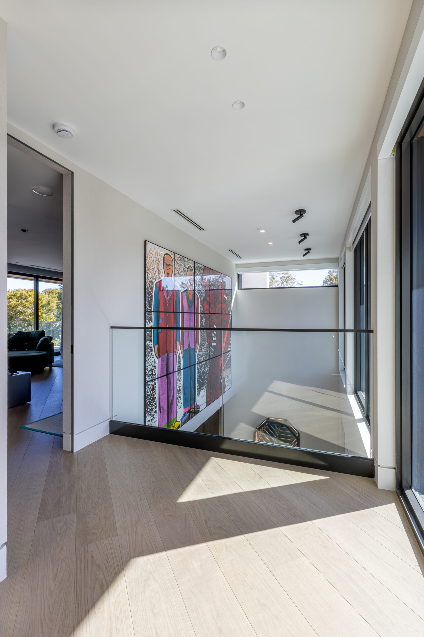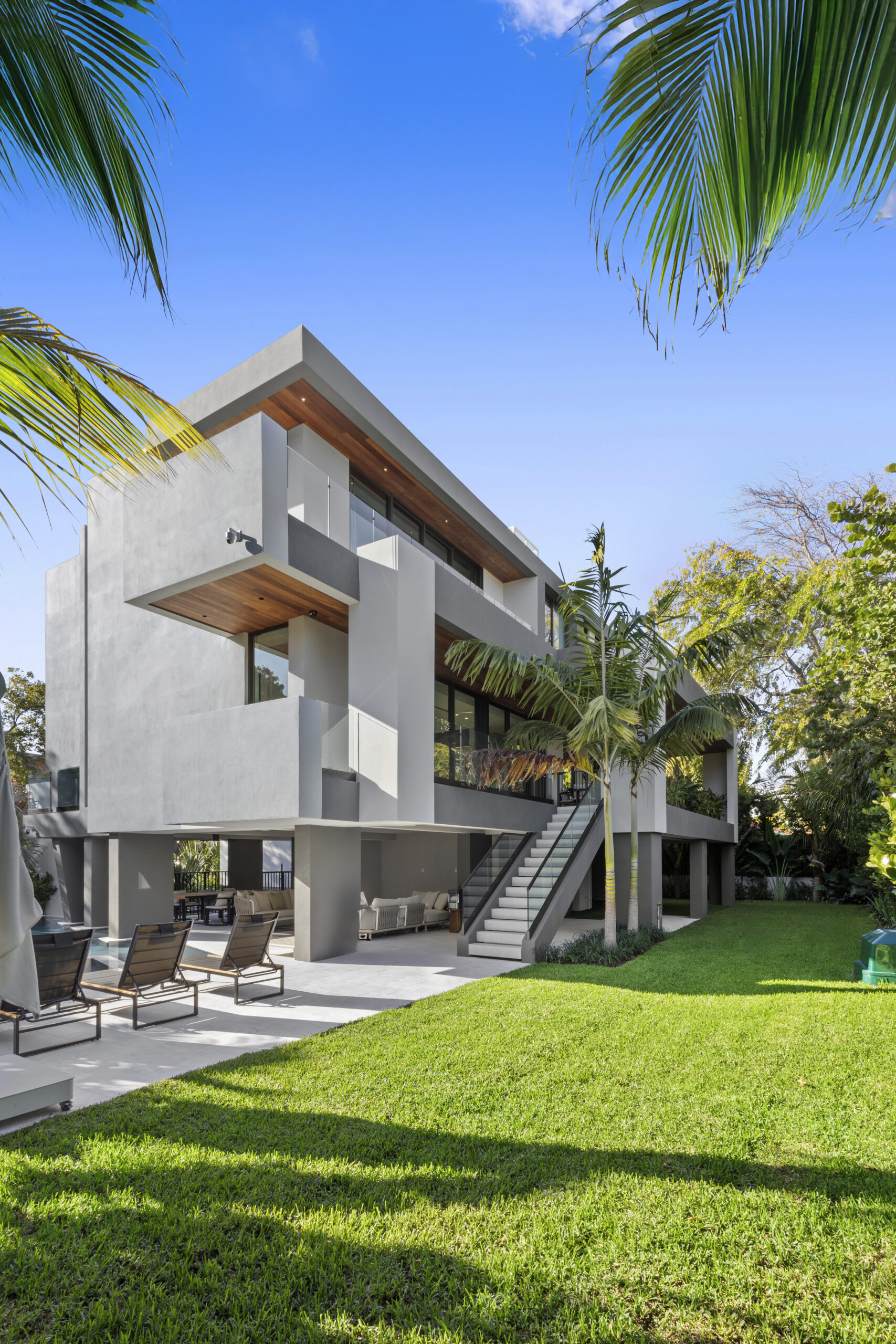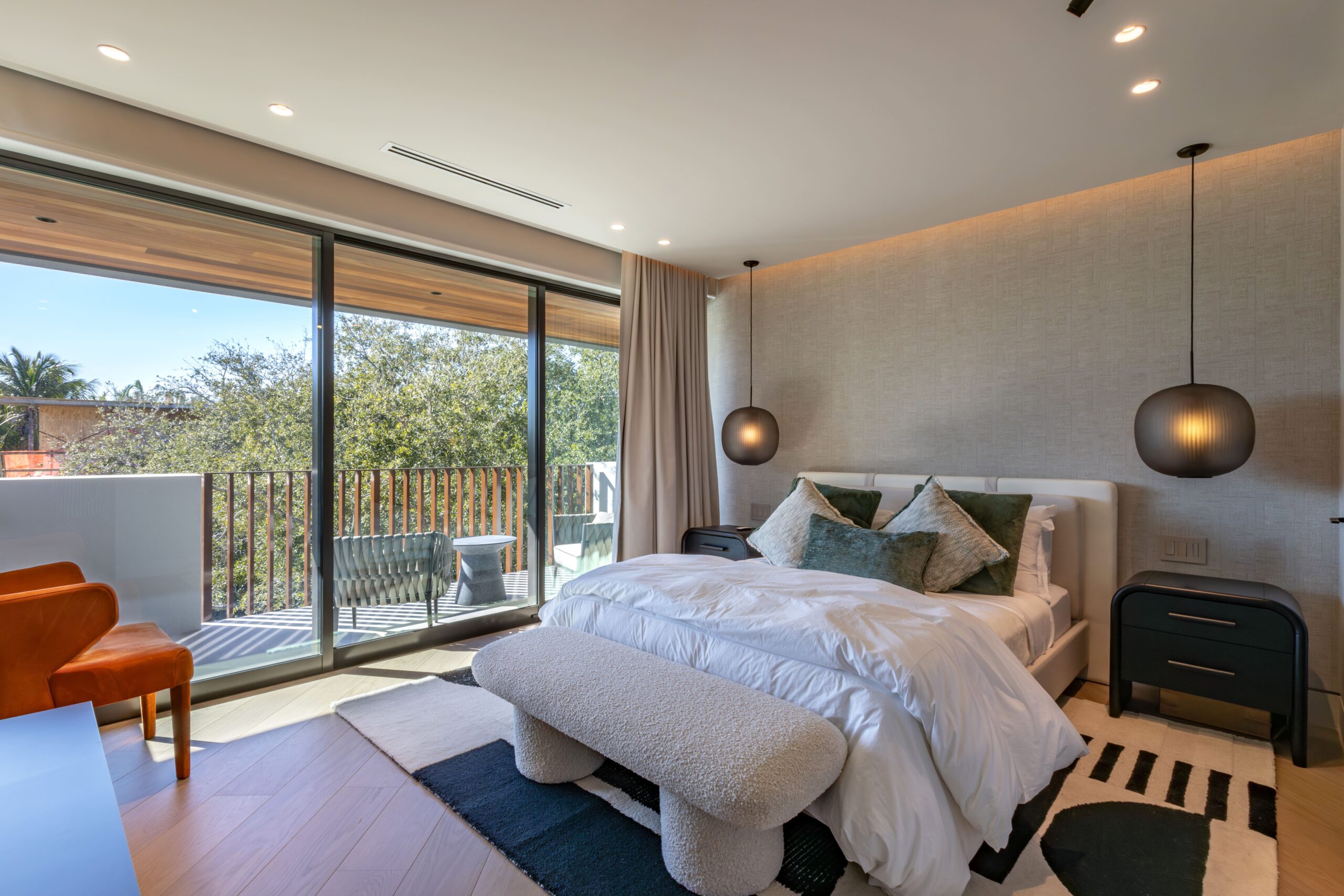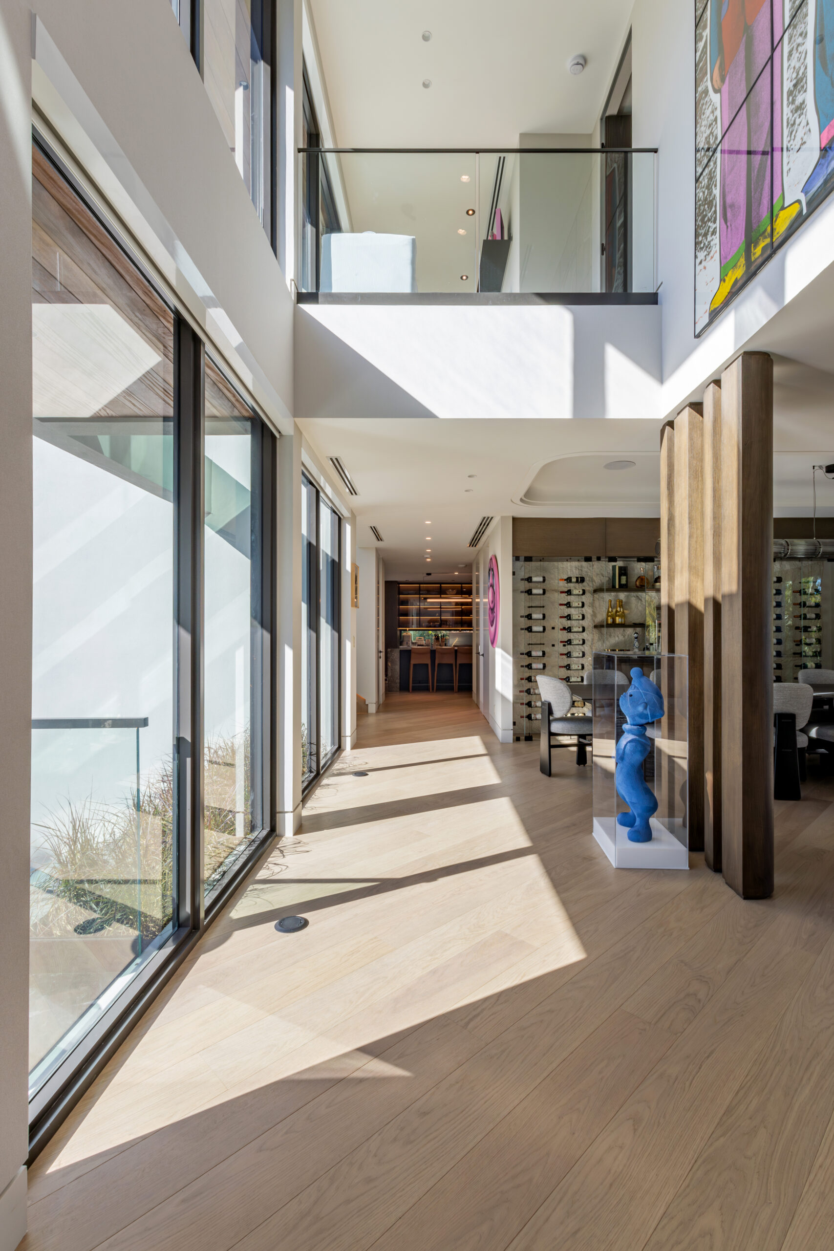 This ultra-modern residence is defined by its interplay of floating cubic forms and cantilevered planes, anchored by a clean material palette and expansive glazing. The architecture embraces transparency and connection to nature, with full-height glass walls and flat roof structures enhancing the sense of openness. Sustainable systems, including an integrated solar array and water-smart landscaping, complement luxury amenities like a custom wine display and a sculptural water feature that transitions into a sleek pool environment.