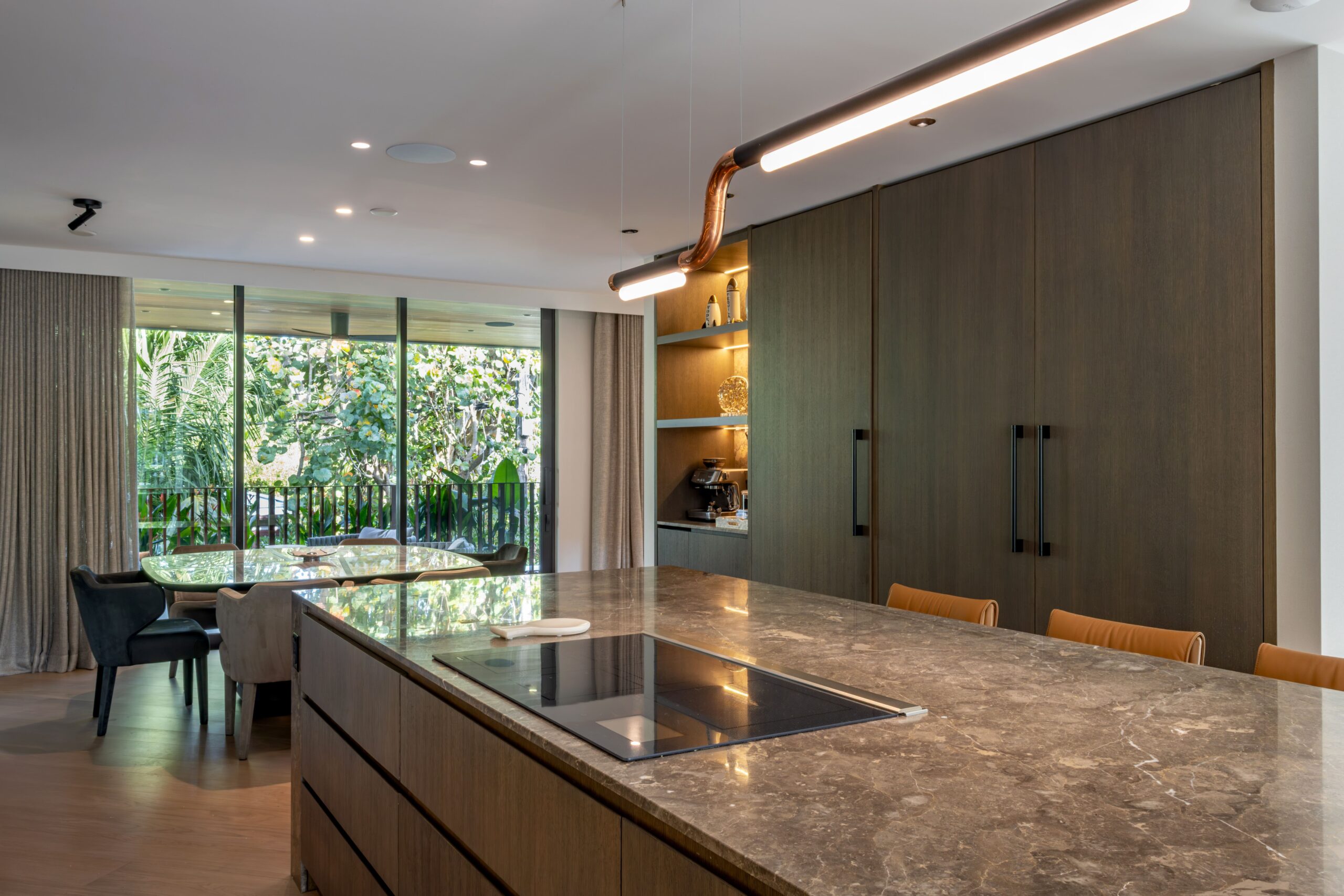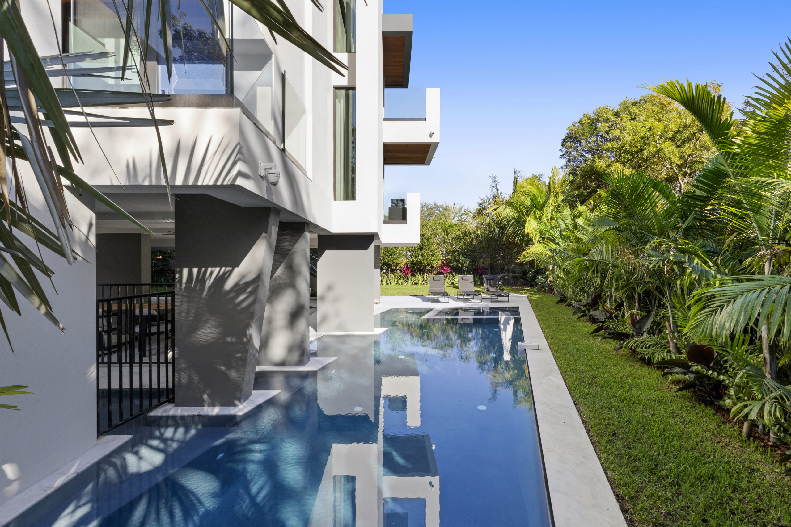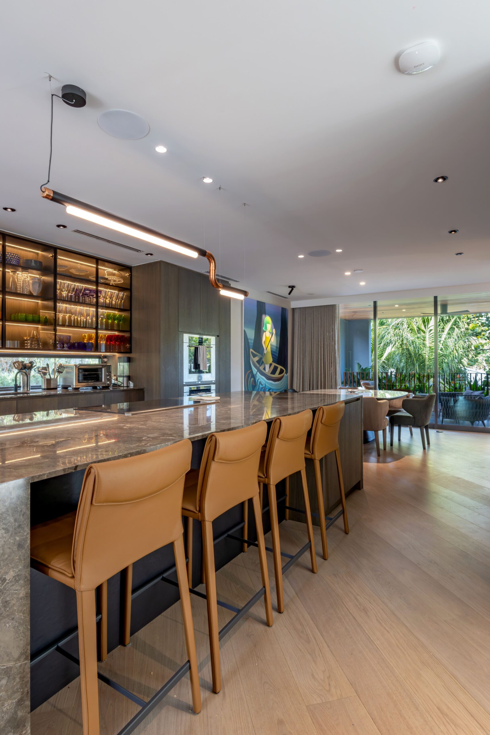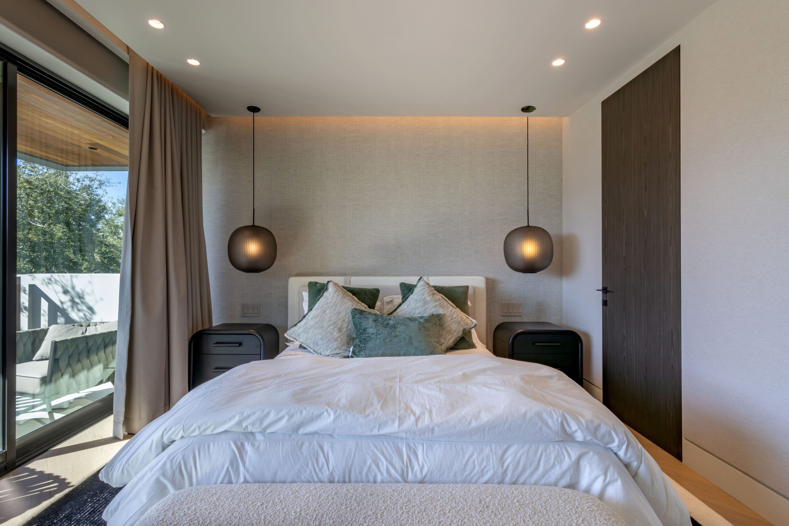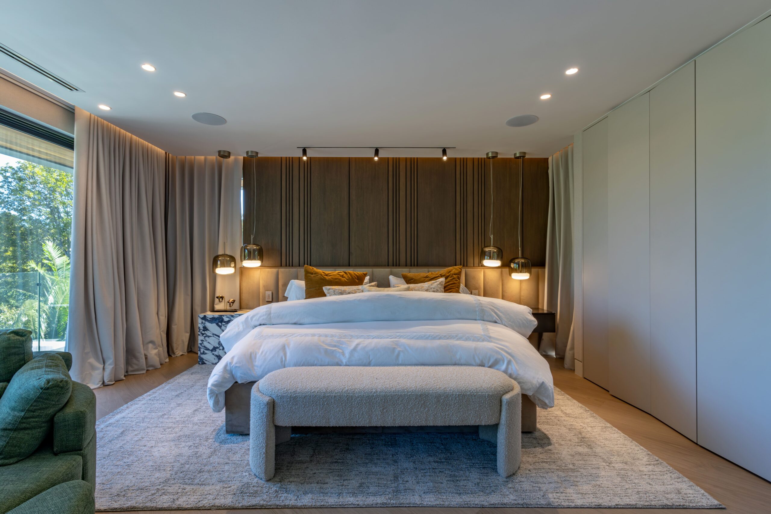 This ultra-modern residence is defined by its interplay of floating cubic forms and cantilevered planes, anchored by a clean material palette and expansive glazing. The architecture embraces transparency and connection to nature, with full-height glass walls and flat roof structures enhancing the sense of openness. Sustainable systems, including an integrated solar array and water-smart landscaping, complement luxury amenities like a custom wine display and a sculptural water feature that transitions into a sleek pool environment.